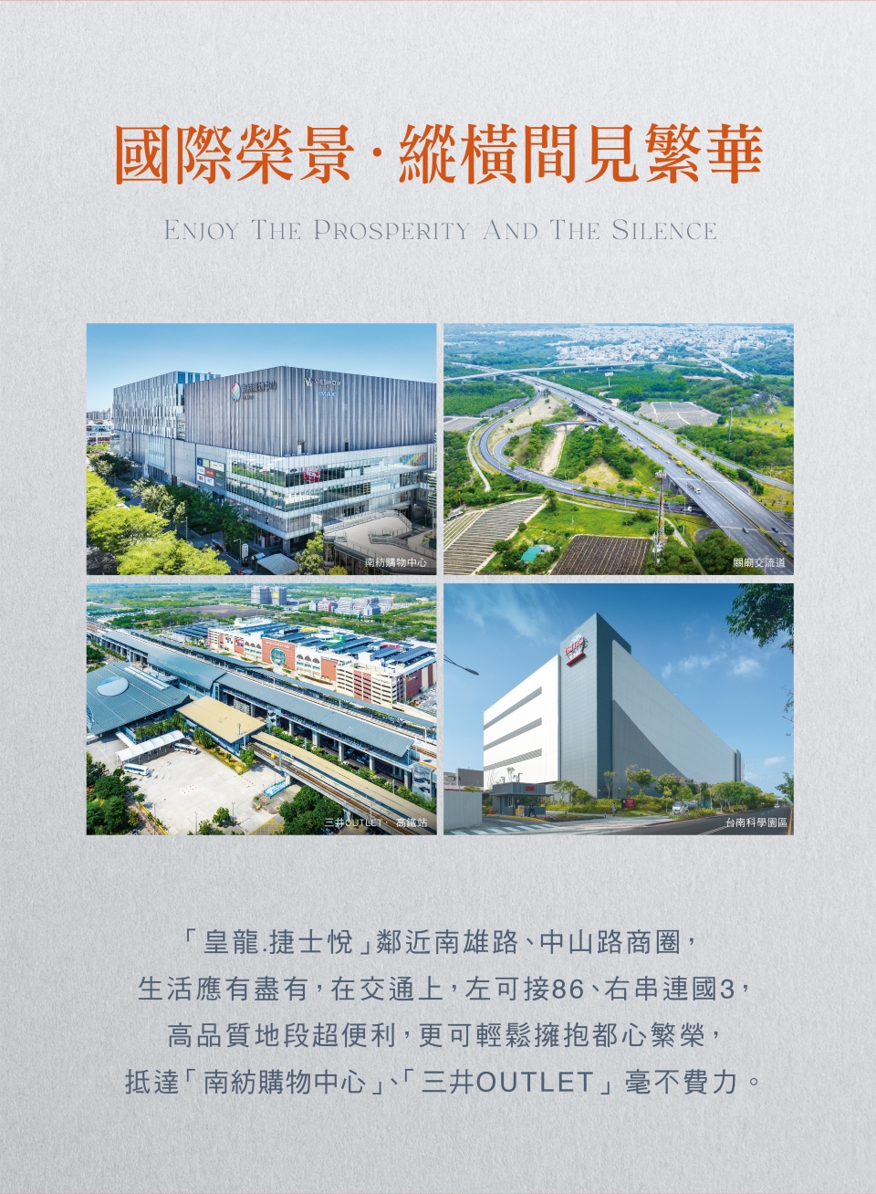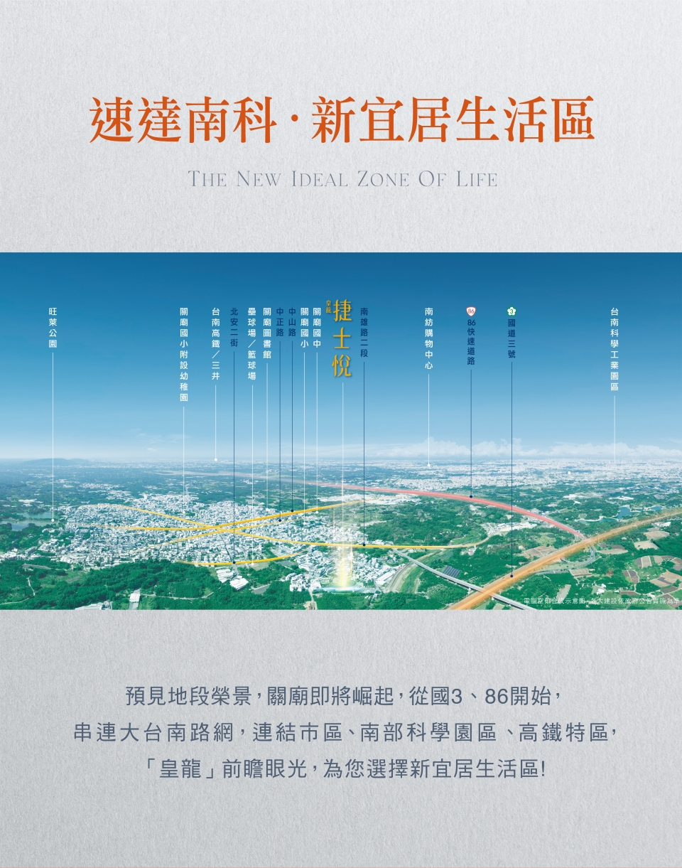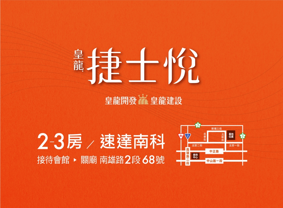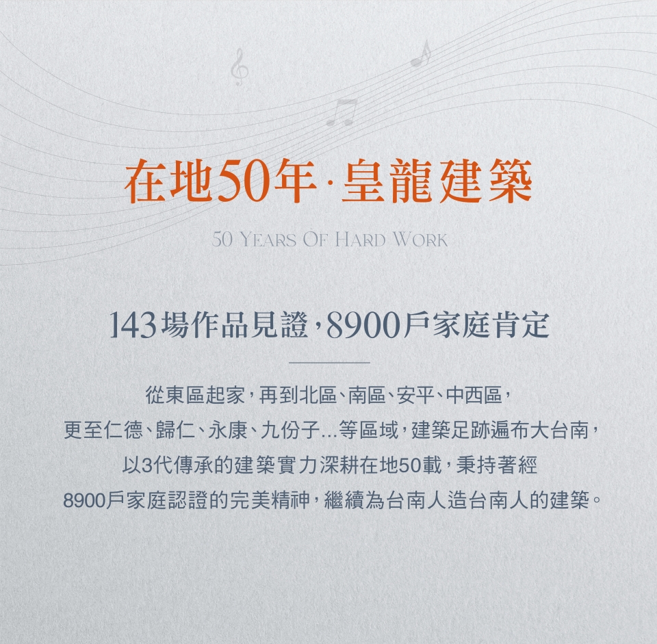 50年,可以成就什麼?對於皇龍而言,是深耕大台南,逾百場的建築作品,是以3代傳承的建築實力守護了近萬戶的家庭,是奠定了「台南人的建築」屹立不搖的地位; 皇龍50,不斷向前,將目光放得更遠,下一章,前進關廟,讓建築「越在地、越國際」。繁華自在,喧囂不染,傍綠而生,美好相映,踏出家門,庭園、公園的綠馥森意,向您微笑道好,輕盈接軌國道3號與台86線,悠遊市心與南科, 且鄰近高鐵國際城與三井OUTLET,讓生活建立在便利之上。回歸建築,外觀以交疊的黑白塊體展現層次,將現代美感極致發揮,透過水景與植栽的點綴,將地景與天光的自然語彙完美融入磚瓦之間。走進空間,讓光與微風發聲,用心規劃戶戶雙面採光、臥室間間開窗-您我心目中真正適合居住的建築。