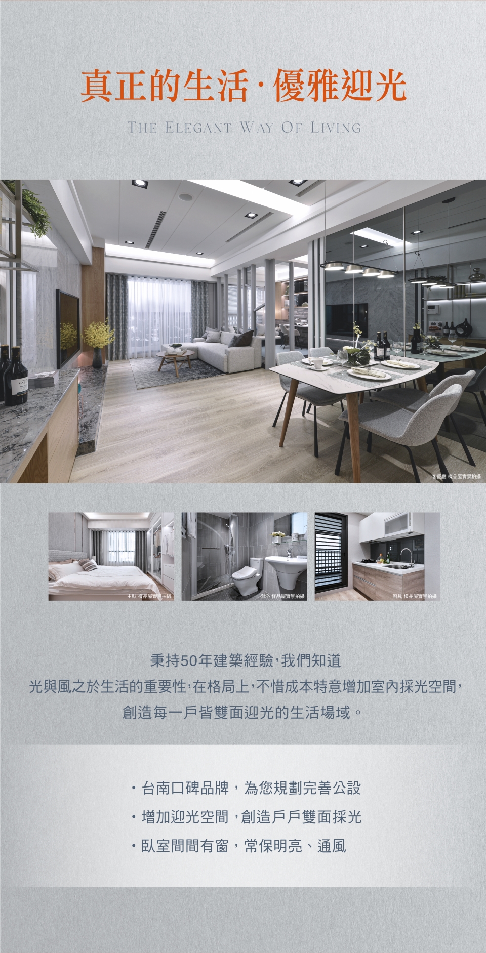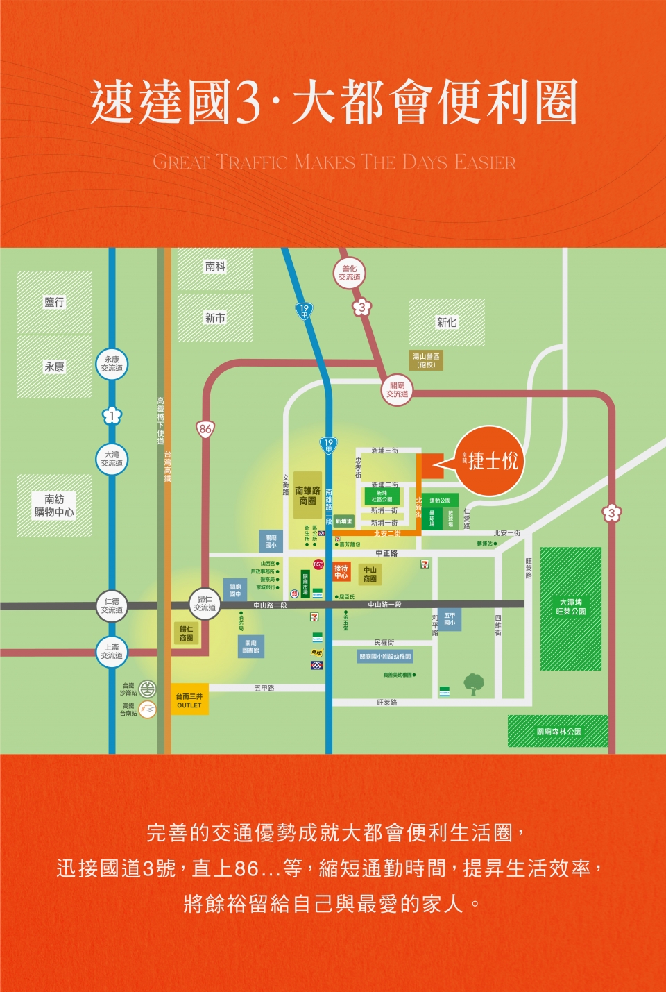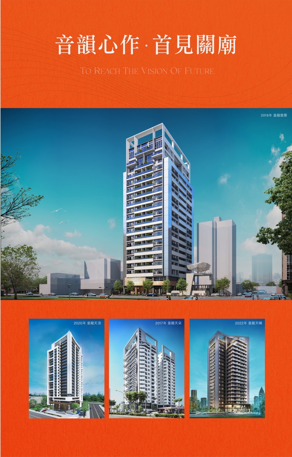 50年,可以成就什麼?對於皇龍而言,是深耕大台南,逾百場的建築作品,是以3代傳承的建築實力守護了近萬戶的家庭,是奠定了「台南人的建築」屹立不搖的地位; 皇龍50,不斷向前,將目光放得更遠,下一章,前進關廟,讓建築「越在地、越國際」。繁華自在,喧囂不染,傍綠而生,美好相映,踏出家門,庭園、公園的綠馥森意,向您微笑道好,輕盈接軌國道3號與台86線,悠遊市心與南科, 且鄰近高鐵國際城與三井OUTLET,讓生活建立在便利之上。回歸建築,外觀以交疊的黑白塊體展現層次,將現代美感極致發揮,透過水景與植栽的點綴,將地景與天光的自然語彙完美融入磚瓦之間。走進空間,讓光與微風發聲,用心規劃戶戶雙面採光、臥室間間開窗-您我心目中真正適合居住的建築。